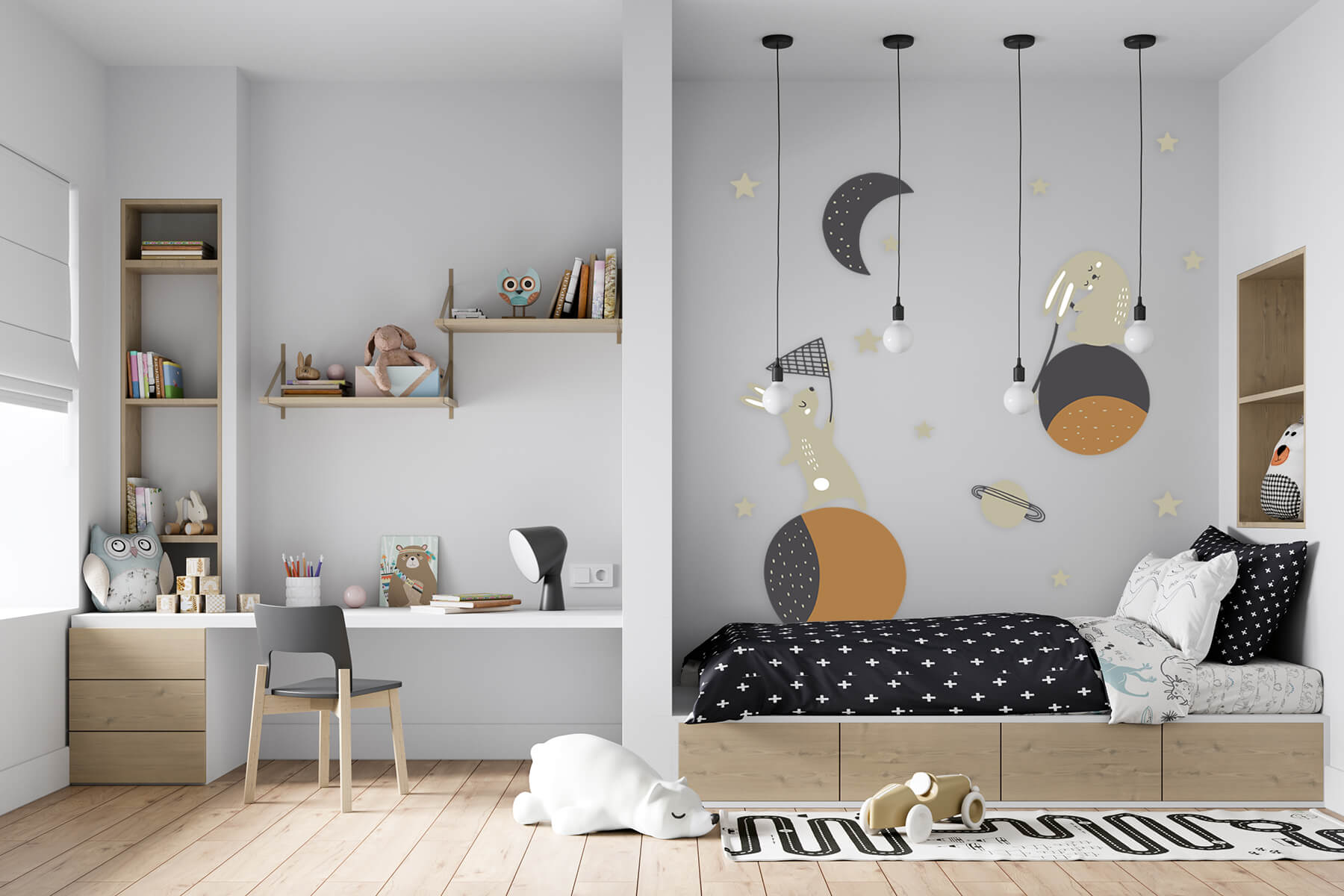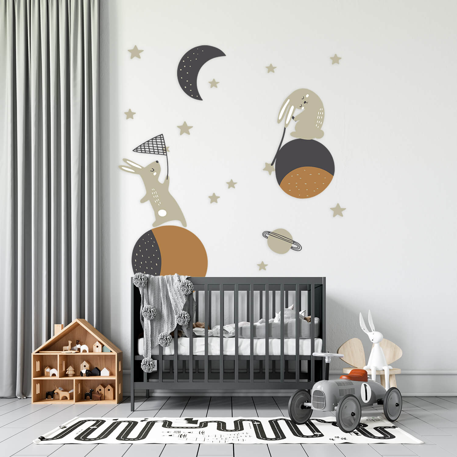 Samolepka je krásnou dekorací, díky které můžete snadno vytvořit útulný dětský koutek. Vaše děti zažijí s králíčky vesmírné dobrodružství a v noci budou hlídat jejich klidnou noc. Samolepky jsou dodávány na archu a je jen na vás jak je v prostoru rozmístíte, můžete je nalepit na zeď, dveře nebo nábytek. Samolepky můžete doplnit o rostoucí metr, který prodáváme samostatně.